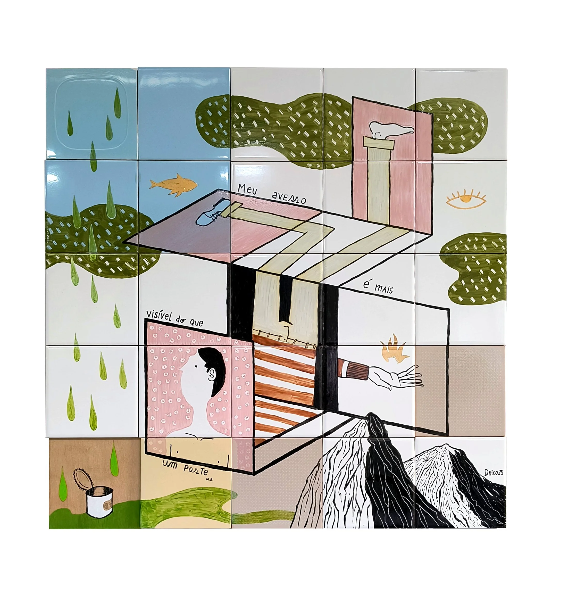 Foi depois de morar em Portugal, onde estudei cerâmica e azulejaria, que passei a imaginar meu trabalho de ilustração em um suporte perene e, sobretudo, em maior escala. Desde então, crio painéis que dialogam com a palavra.