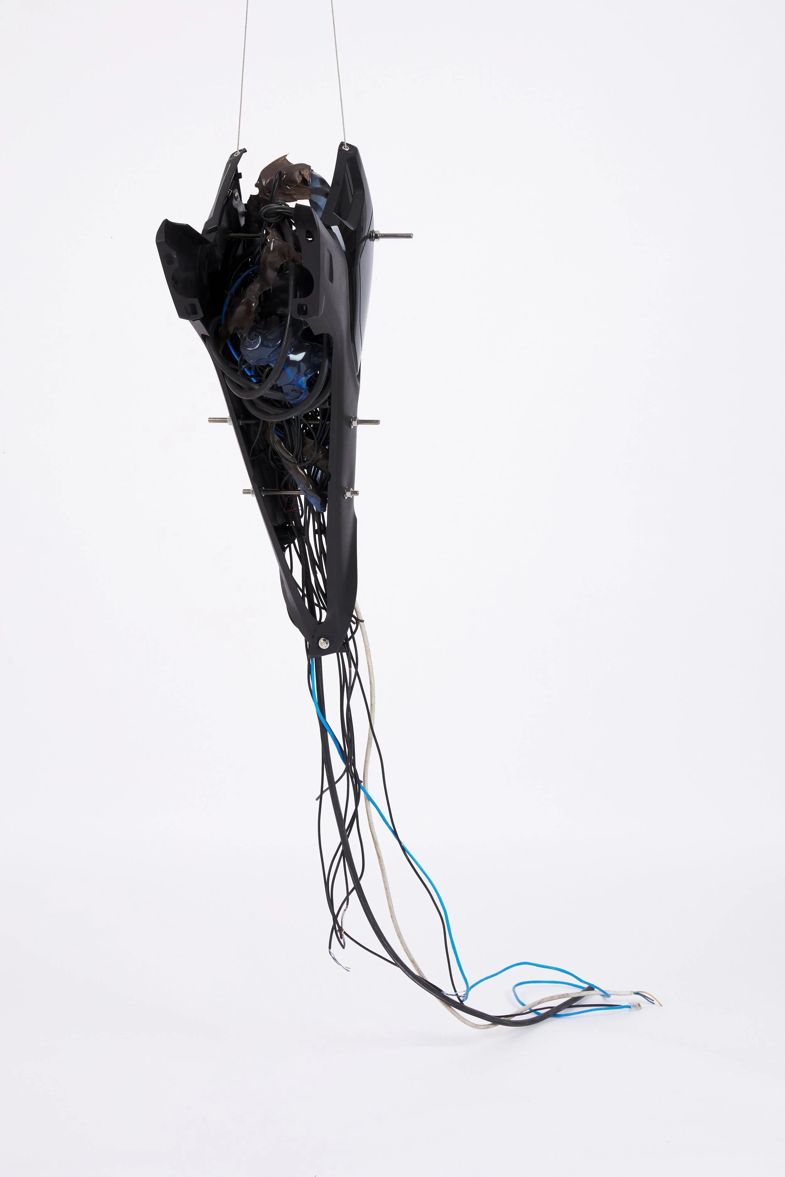 Seu trabalho investiga a fusão instável entre corpo orgânico e artificial sob lógicas relacionais de poder, eficiência e controle. Entre função e falha, se revelam em mutação evidenciando um corpo híbrido, suspenso entre colapso e criação. Nesse terreno de incerteza e caos, emergem fabulações que desafiam limites entre natureza, tecnologia e existência.