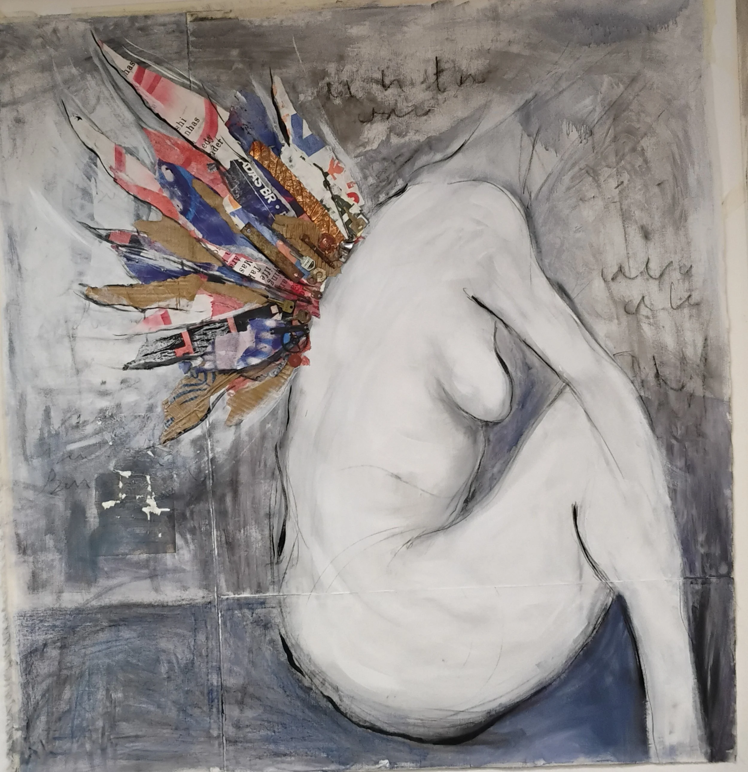 Acrílica, carvão, papel, objetos de metal, pastel óleo.