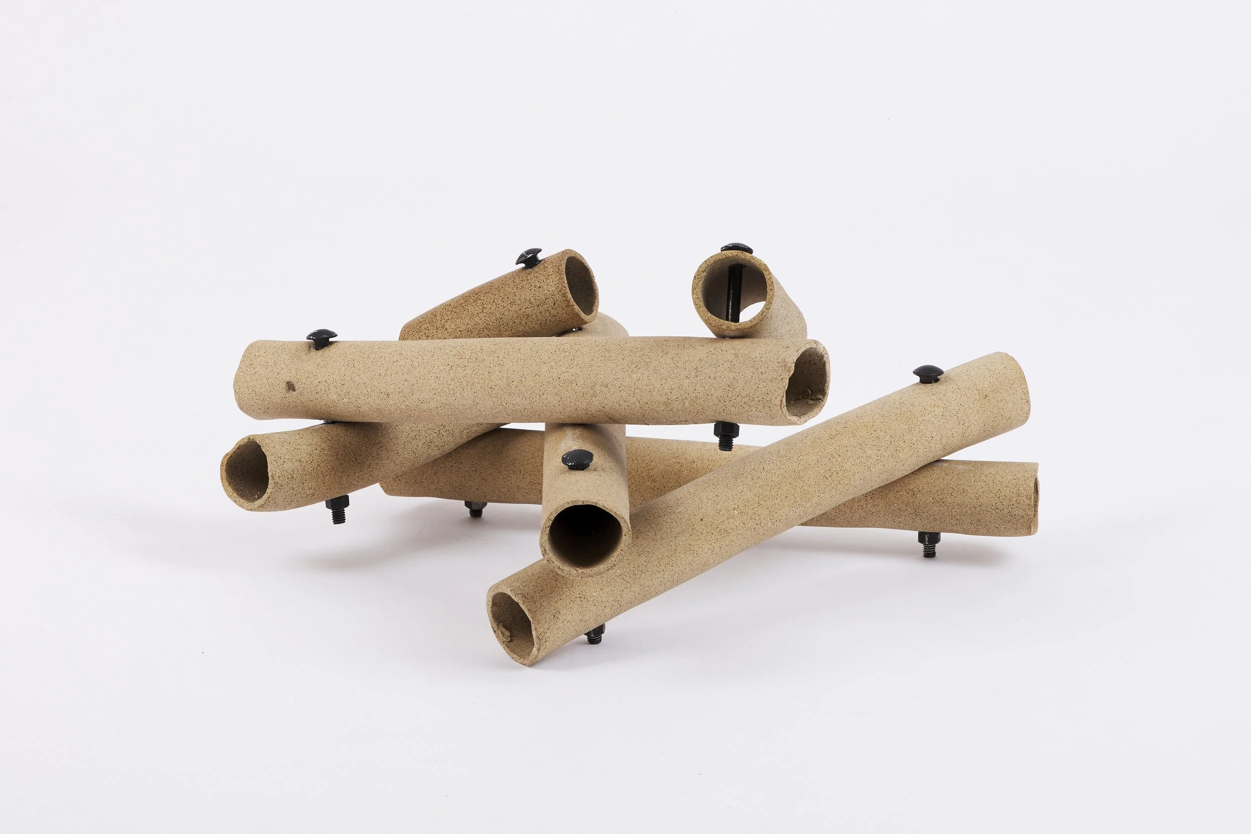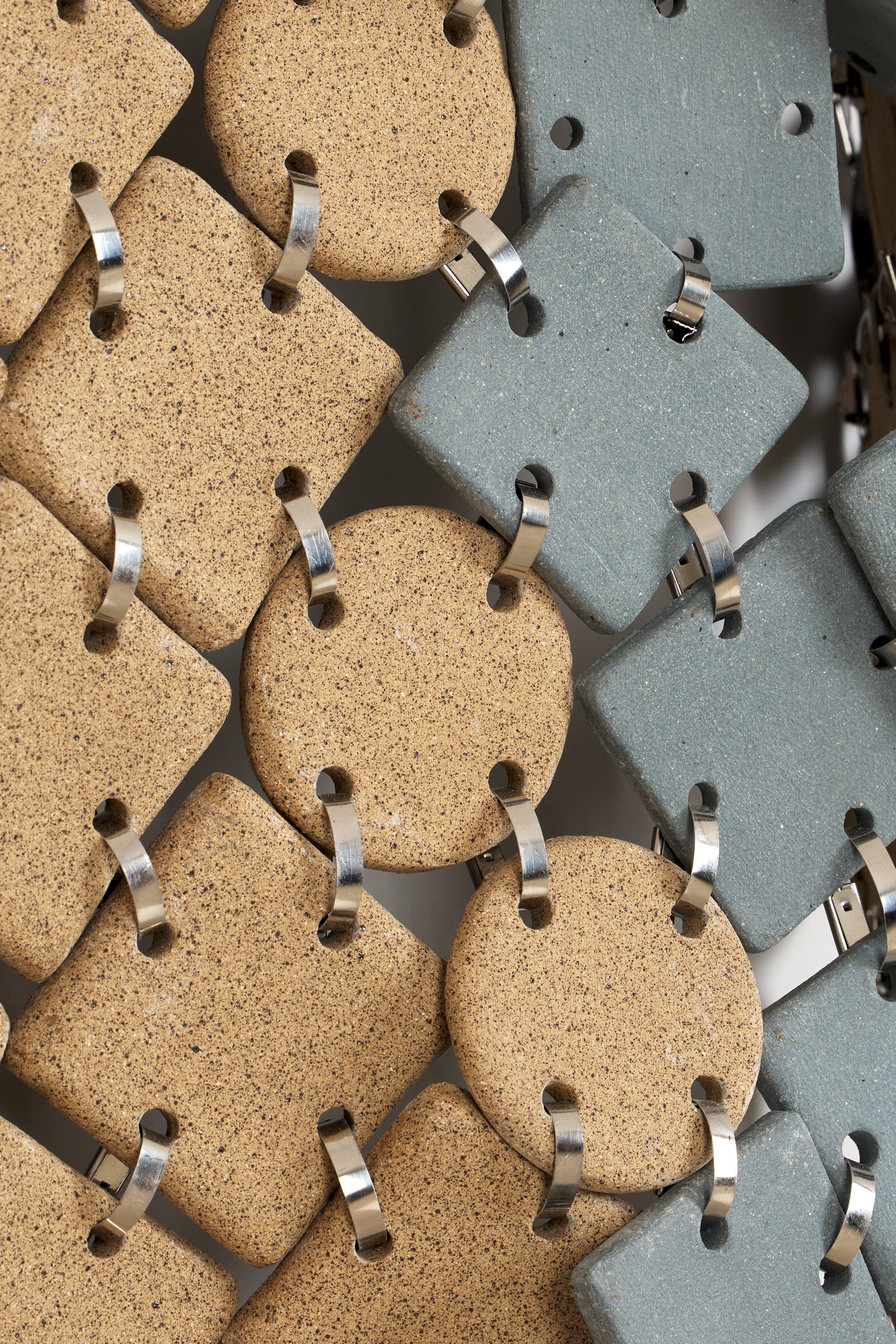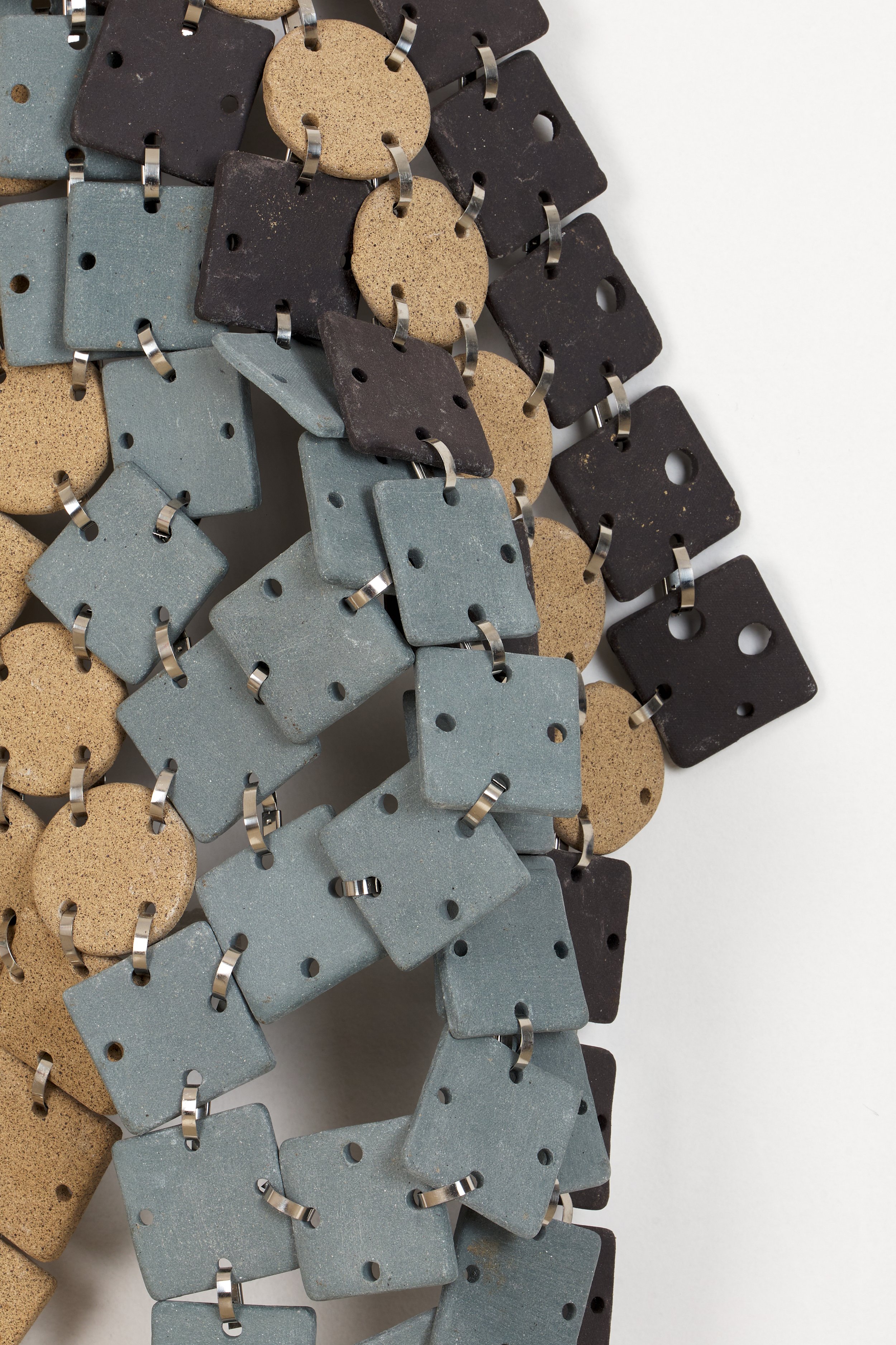 Cerâmica, argila tabaco, preta e azul e abraçadeiras de alumínio